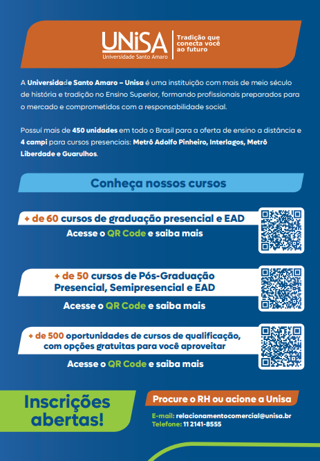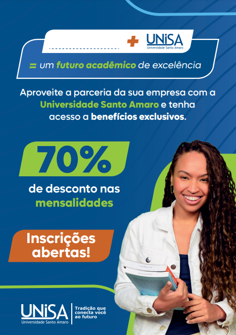 Em parceria com a ASJCOESP, a UNISA está oferecendo descontos de 15% até 70% – nos cursos de Graduação (exceto Medicina), 30% para Pós-graduação (com exceção para Mestrados) e cursos livres gratuitos.